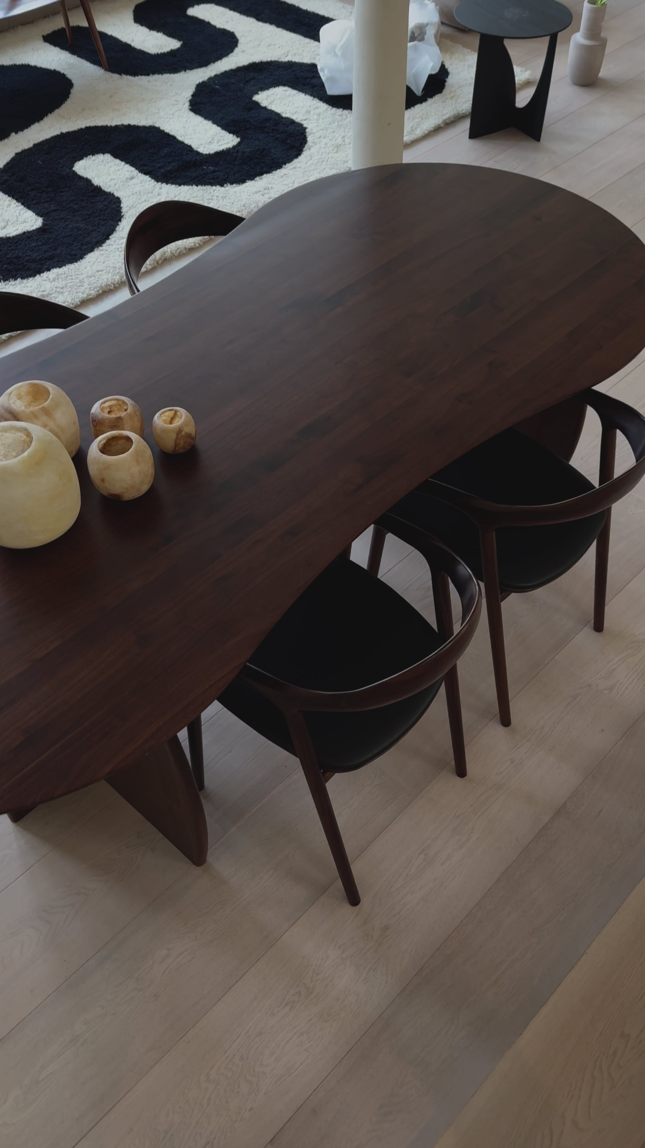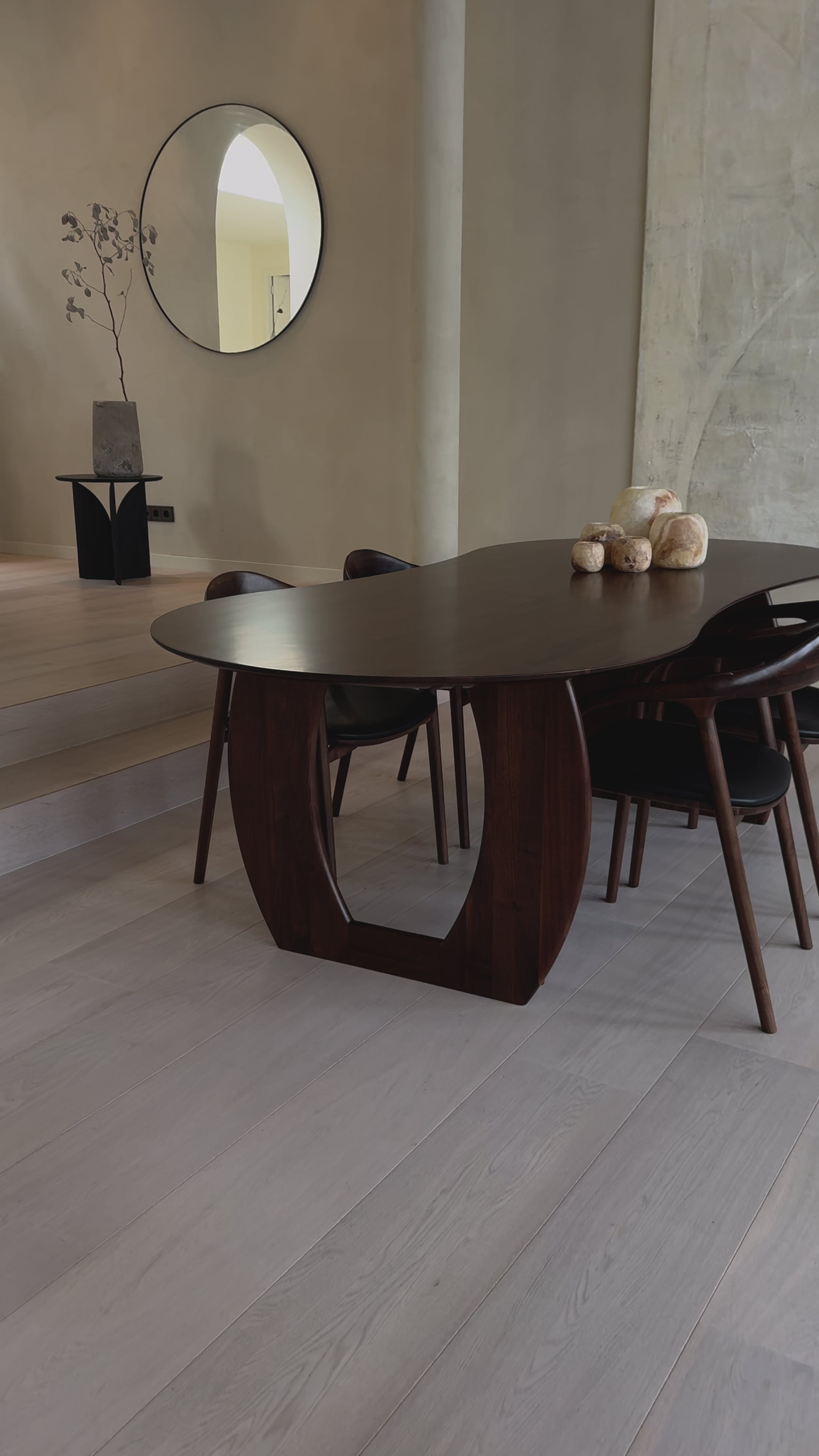 Met zijn krachtige, unieke poten en strakke verjongde lijnen is de Halo tafel een meesterwerk van minimalistisch design. Het biedt de perfecte balans tussen functionaliteit en esthetiek, waardoor het een tijdloze toevoeging is aan elk interieur. Het natuurlijke walnoot- of eikenhout straalt warmte en karakter uit, waardoor elke maaltijd, gesprek of moment van samenzijn een bijzondere ervaring wordt.